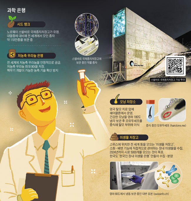 | 은행은 내 재산을 안전하게 지켜주는 든든한 기관이다. 과학계에도 은행이 있다. 다만 과학은행은 돈이 아닌 다른 것을 저장한다. 대표적인 과학 은행은 종자를 보관하는 '시드 뱅크(seed bank)'입니다. 노르웨이 스발바르 국제종자저장고가 가장 유명하다. 전 세계에서 모인 종자 약 110만 종을 보관하고 있다. 미래에 대멸종 사타가 벌어질 거세 대비해 만들었다. 지난 3월에는 온라인으로 종자 보관소 내부를 견학할 수 있는 가상 체험 홈페이지(QR코드)를 공개했습니다.